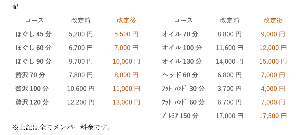 つきましては、2026年1月4日より、施術料金を下記のように改定させていただきたく存じます。